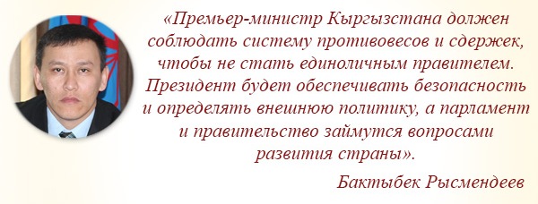 «Вносимые поправки в Конституцию будут способствовать тому, чтобы власть не концентрировалась в одних руках», - сообщил ИА «24.kg» заведующий кафедрой конституционного и муниципального права Кыргызской государственной юридической академии Бактыбек Рысмендеев после изучения проекта.