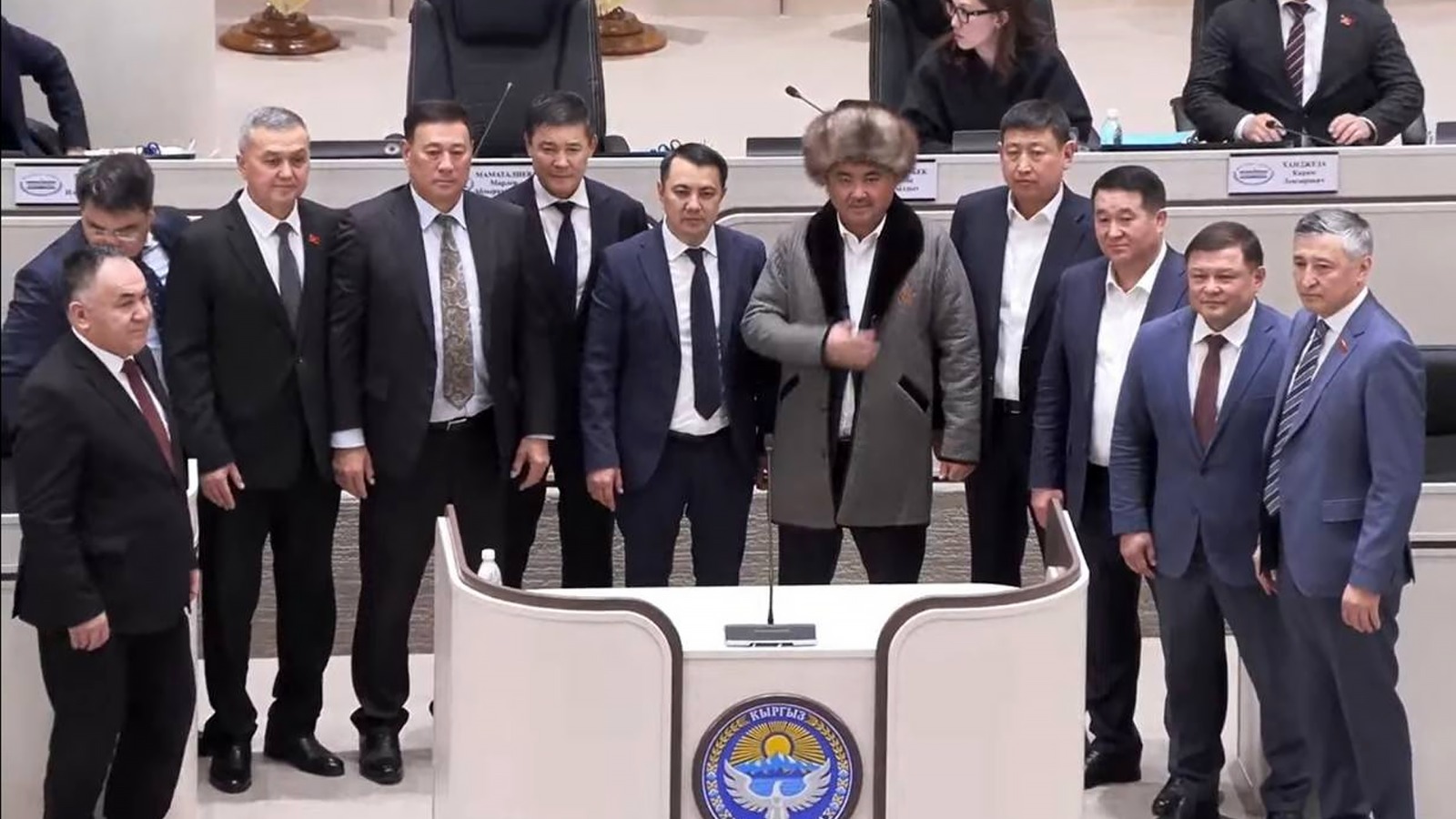 После часть депутатв собрались у трибуны парламента, поблагодарили его за работу и надели на него национальную одежду — чапан и тебетей.