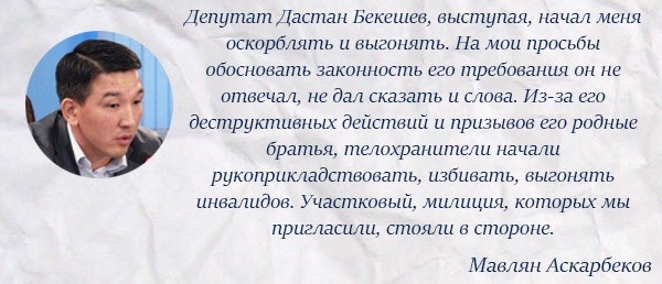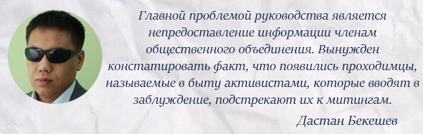 Активист обвинил Бекешева в том, что он защищает неправомерные действия руководителя общества слепых и глухих Калыка Мамбетакунова. Скандал достиг своего апогея на одном из собраний.