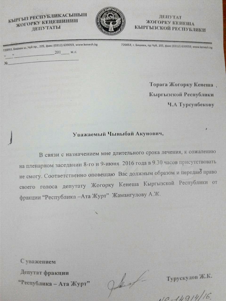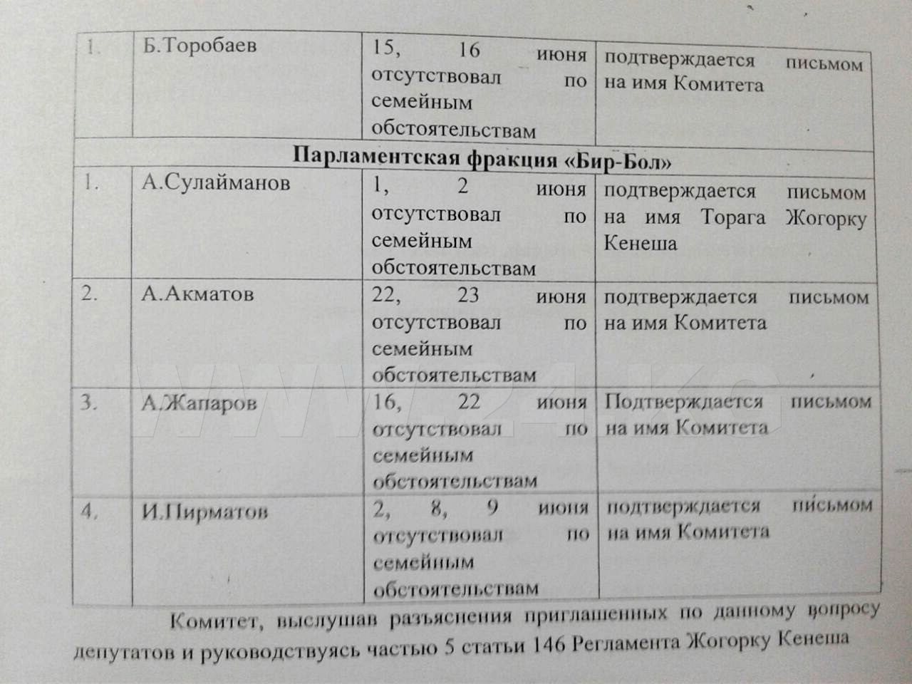 И, наконец, по болезни (в документах это указано как «временная нетрудоспособность» и «уважительная причина») заседания пропустили представители РАЖ Жыргалбек Турускулов (8, 9 июня) и Нургазы Нишанов (8, 9, 22 июня). Последний также пропустил заседание 23 июня