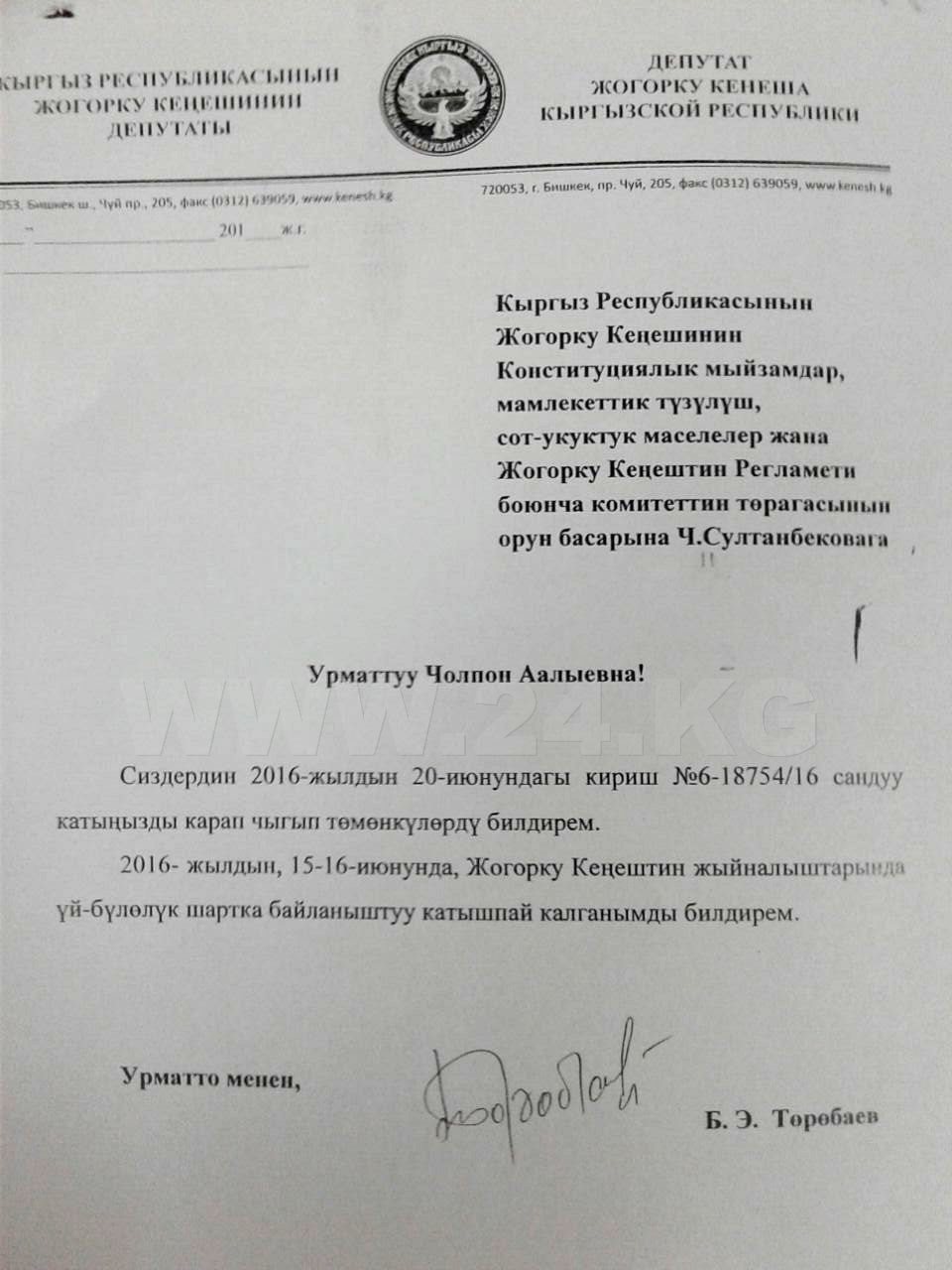 Эту же причину («семейные обстоятельства») указали депутаты РАЖ Айбек Алтынбеков (9 июня) и Махабат Мавлянова (1 июня).