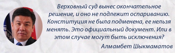 Между тем член «Ата Мекена» Алмамбет Шыкмаматов напомнил собравшимся о решении Конституционной палаты Верховного суда, которая еще в 2014 году постановила: вносить изменения в Конституцию до 2020 года запрещено.
