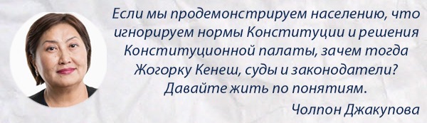 Следует отметить, что Жогорку Кенеш хочет изменить более 30 статей Конституции. Чолпон Джакупова настаивала на вынесение каждой поправки в отдельный вопрос в бюллетене.