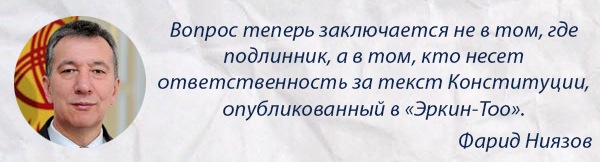 «Вернее, он (текст Конституции) никем не подписан - ни разработчиками, среди которых был Омурбек Текебаев, ни главой секретариата ВП, этот пост на тот момент занимал Данияр Нарымбаев, ни главой аппарата временного правительства, который возглавлял Эмильбек Каптагаев, ни Розой Отунбаевой, которая после референдума 2010 года стала президентом переходного периода», - рассказал Фарид Ниязов.