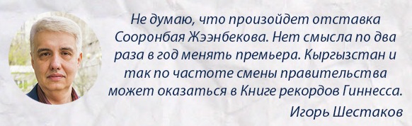 «Что же касается лидера фракции «РАЖ» Омурбека Бабанова, он вряд ли захочет занять пост премьер-министра. По крайней мере, не думаю, что это произойдет сейчас. Омурбек Бабанов позиционирует себя одним из основных претендентов на президентский пост, а кресло премьера вряд ли стоит рассматривать в качестве успешного трамплина. Скорее, с него можно только падать, а не взлетать», - заключил Игорь Шестаков.