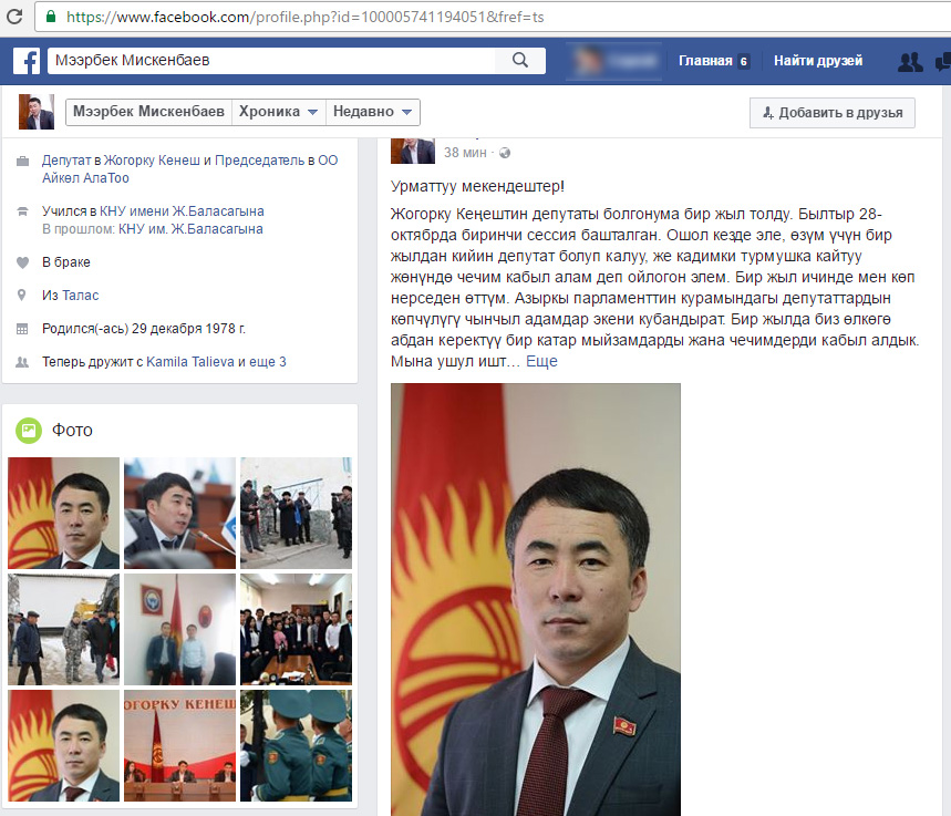 Депутат фракции СДПК Мээрбек Мискенбаев сдал свой мандат и покинул парламент. Об этом он заявил на своей странице в «Фейсбуке», но отметил, что продолжит поддерживать политику президента страны Алмазбека Атамбаева.