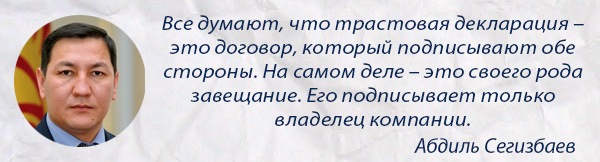 По его словам, в документах сказано, что в 2009-2010 годах компания Southfield принадлежала Максиму Бакиеву. В 2012 году от имени владельцев компании выпущена трастовая декларация. В ней сказано, что трем известным кыргызским политикам передается по 7-8 процентов доли в Southfield. Главным условием было то, чтобы они способствовали продаже ЗАО «Альфа Телеком» не меньше чем за $50 миллионов.