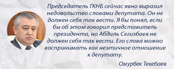 Омурбек Текебаев вступился за бывшего пресс-секретаря президента - члена ЖК от фракции СДПК Жанара Акаева. С критикой последнего выступил председатель ГКНБ Абдиль Сегизбаев.