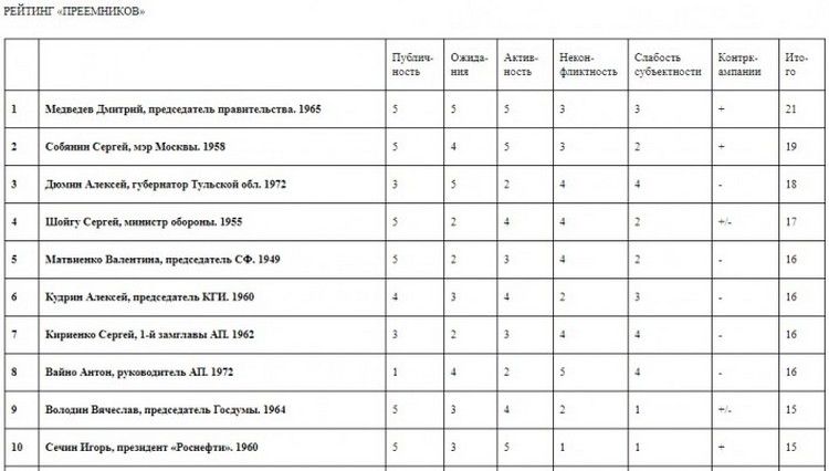 Лидерами рейтинга стали премьер-министр России Дмитрий Медведев, мэр Москвы Сергей Собянин, губернатор Тульской области Алексей Дюмин, министр обороны РФ Сергей Шойгу, спикер Совета Федерации Валентина Матвиенко. А также директор Центра стратегических разработок Алексей Кудрин, глава администрации президента Антон Вайно, его заместитель Сергей Кириенко, спикер Госдумы Вячеслав Володин и глава «Роснефти» Игорь Сечин.