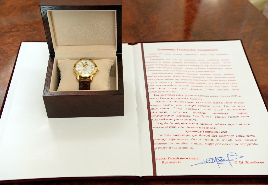 Сооронбай Жээнбеков вручил юбиляру именные часы президента страны.