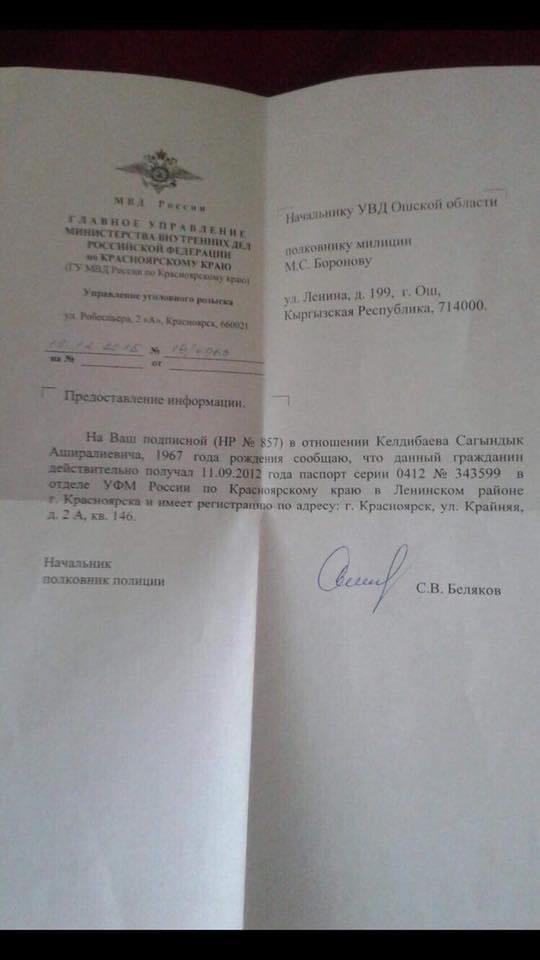 Пользователь Facebook Ыргал Кадыралиева опубликовала сегодня справку о выходе Сагындыка Келдибаева из российского гражданства.
