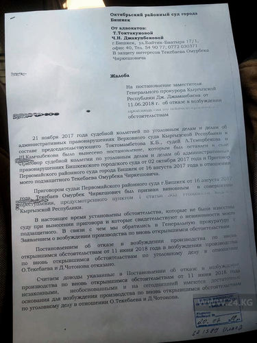 Адвокат Таалайгуль Токтакунова подала сегодня заявление в Октябрьский районный суд Бишкека на решение Генеральной прокуратуры об отказе в пересмотре уголовного дела экс-депутата парламента Омурбека Текебаева по вновь открывшимся обстоятельствам. Об этом она сообщила ИА «24-kg.com».