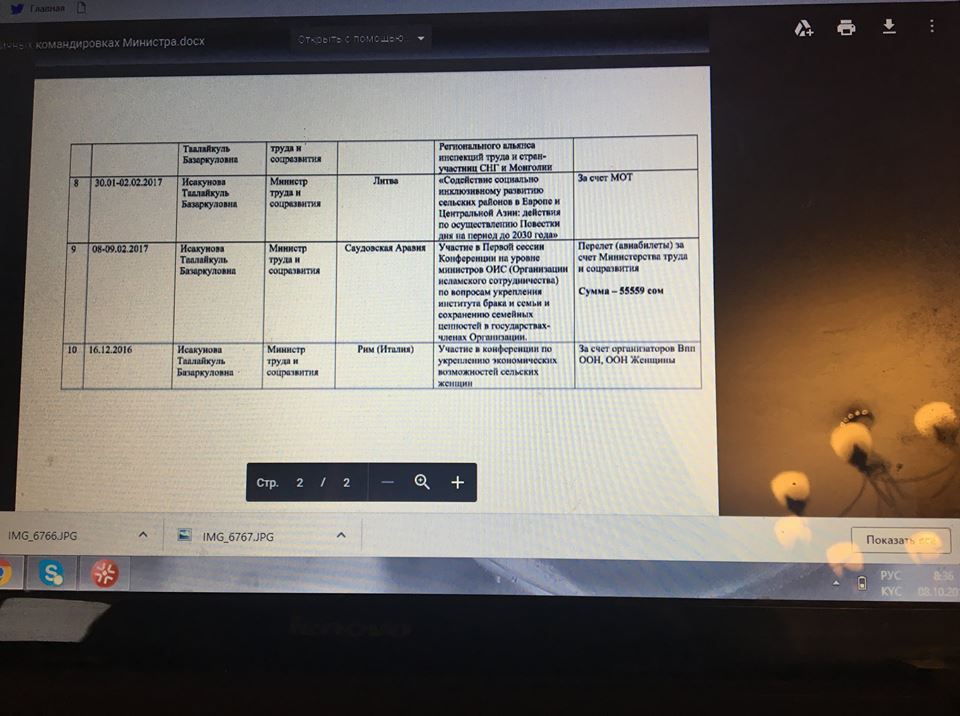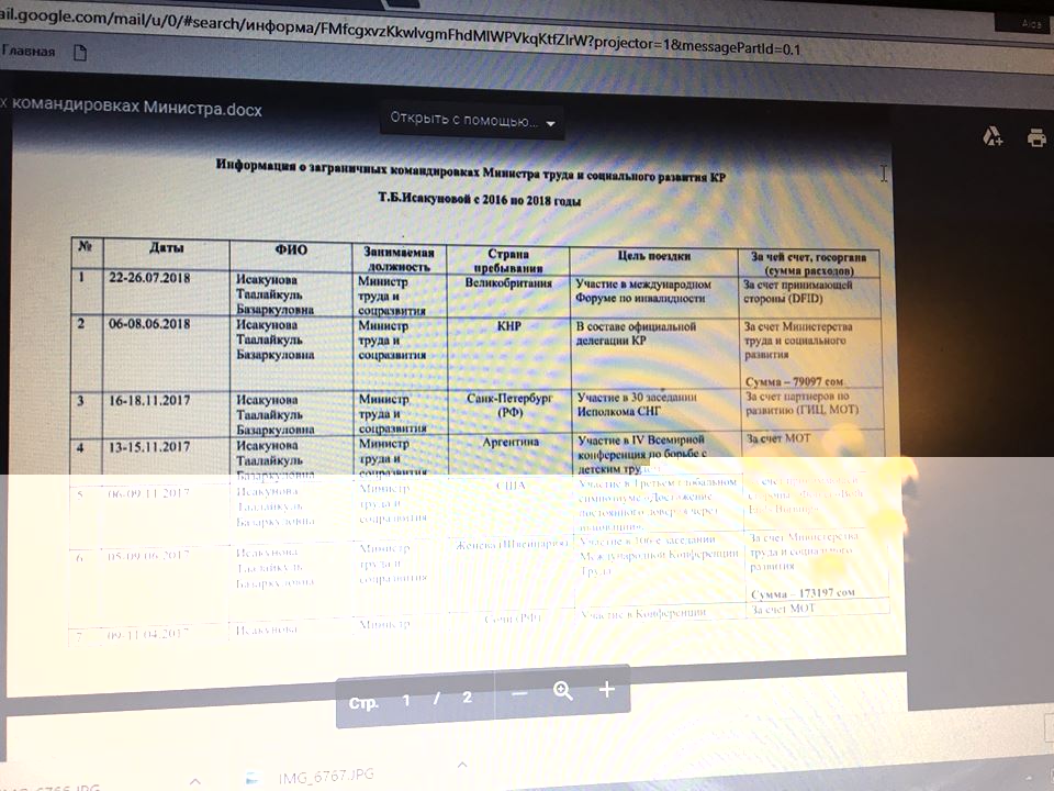 По ее словам, с 6 по 9 ноября 2017 года Таалайкуль Исакунова находилась в США, где обсуждались вопросы по новому положению аккредитации международных американских агентств, занимающихся международным усыновлением, но не получивших аккредитацию в КР. Об этой поездке министр не информировала премьер-министра.