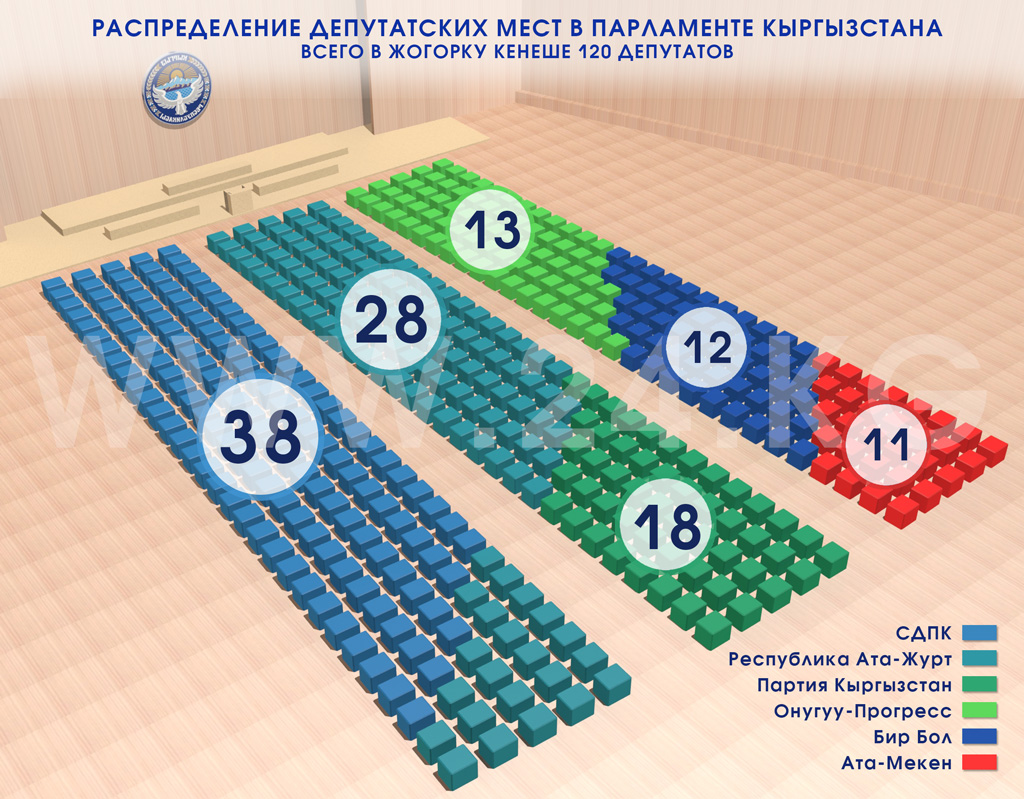 По ним СДПК набрала 27,56 процента голосов избирателей (38 мандатов), «Республика – Ата Журт» - 20,26 процента (28 мандатов), «Кыргызстан» - 13,07 процента (18 мандатов), «Онугуу-Прогресс» - 9,39 процента (13 мандатов), «Бир Бол» - 8,59 процента (12 мандатов), «Ата Мекен» - 7,08 процента (11 мандатов).