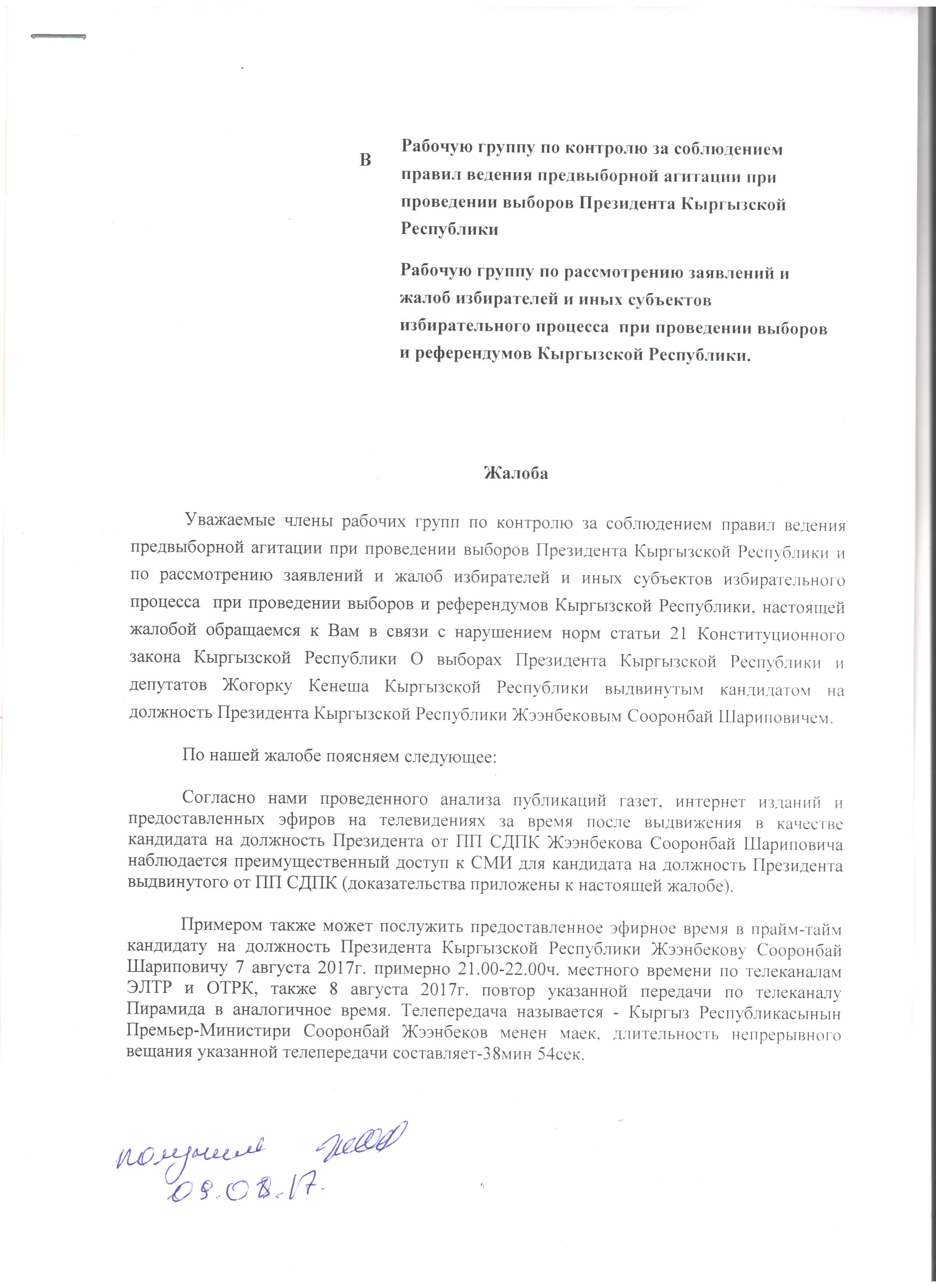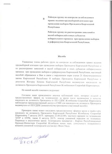 В штабе также отметили, что к жалобе прилагаются необходимые доказательства нарушений правил агитации со стороны Сооронбая Жээнбекова. В частности, в ЦИК представлен детальный анализ новостных выпусков телеканалов, которые наглядно демонстрируют превышение служебных полномочий действующим премьером.