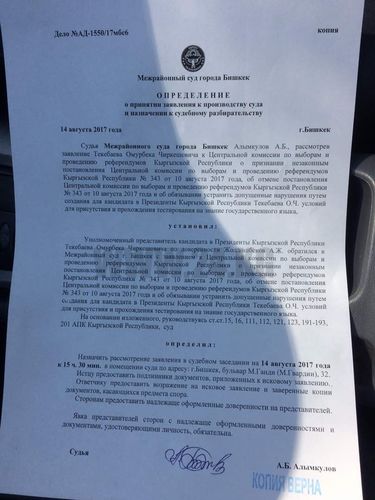 Уполномоченный представитель кандидата в президенты Текебаева — Алмаз Жолдошбеков — обратился в Межрайонный суд Бишкека с заявлением признать постановление ЦИК незаконным.
