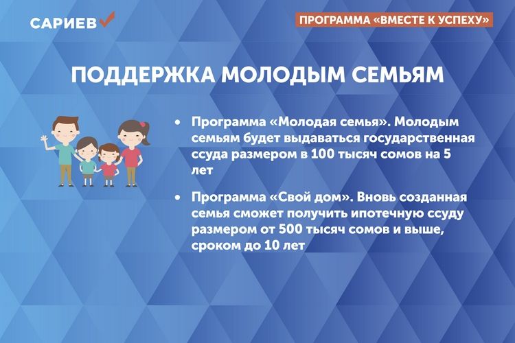 Каждая молодая семья сможет получить от государства ипотечную ссуду размером от 500 тысяч сомов и выше, сроком до 10 лет.