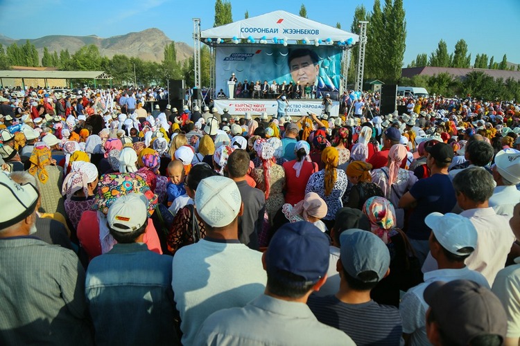 Более 10 тысяч жителей Аксыйского района собрались на стадионе в Кербене, чтобы выразить поддержку кандидату на пост президента Кыргызской Республики Сооронбаю Жээнбекову в предвыборных гонках. Уже до прихода кандидата на место встречи, во время концертной программы, избиратели скандировали его имя.