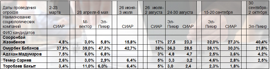 «К сожалению, таким примером является попытка одного из кандидатов навязать обществу ничем не подтвержденные данные о якобы готовности «65,5 процента населения» голосовать за него «в первом туре». Считаю важным довести до общественности реальную информацию. В частности, о результатах социологических исследований, которые проводились ведущими социологическими службами Кыргызстана с марта по октябрь 2017 года», — говорится в обращении.