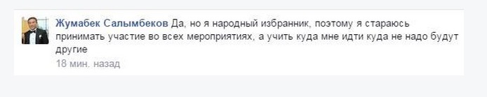 Общаться с журналистами выходец из семьи базаркомов не пожелал, а комментарии раздает через социальные сети. Жумабек Салымбеков искренне недоумевает, почему «культурное мероприятие в театре» вызвало негативный общественный резонанс. Он рассказал, что пошел в театр оперы и балета исключительно «как культурный человек». И подтвердил, что в театре праздновали день рождения его друга. «Каждый отмечает свой день рождения, где хочет. Сначала в театре было представление, после чего открылся занавес, где именинником был организован стол. Никто этого не ожидал. Это стало неожиданностью и для меня», - написал нардеп в соцсетях.